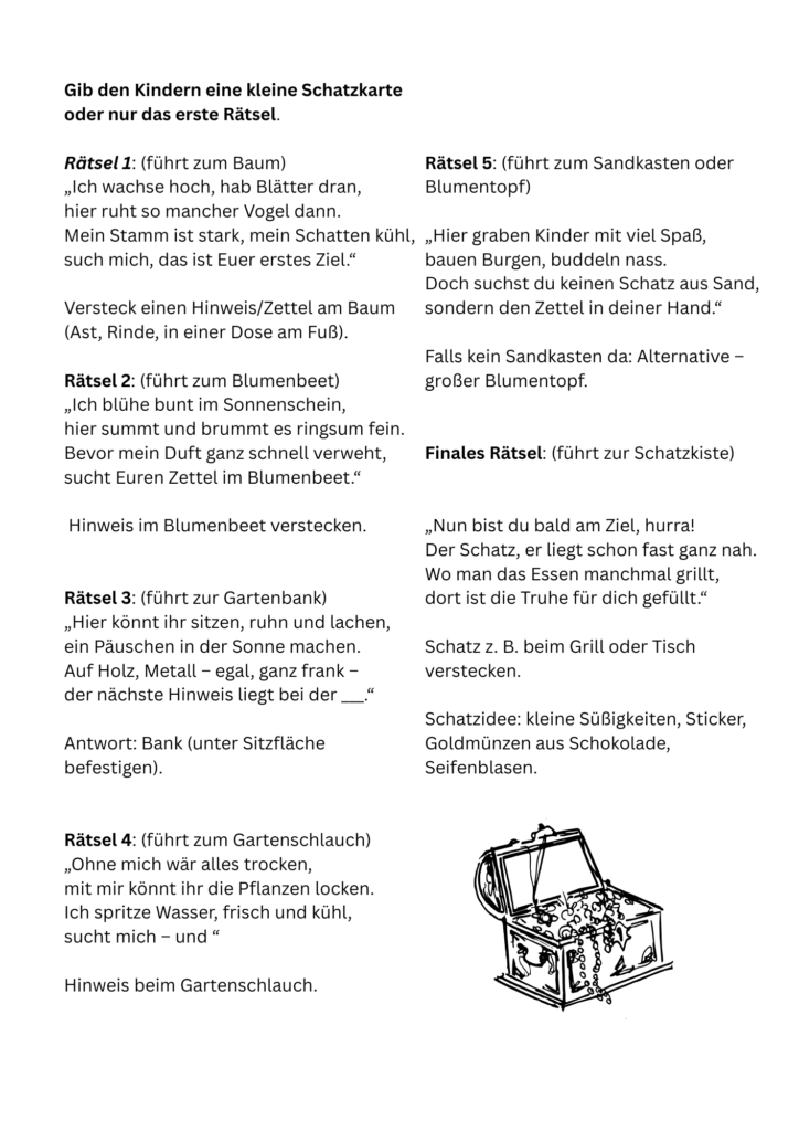 Wenn ihr Lust auf Abenteuer im eigenen Garten habt – mit Spaß, Teamgeist und Überraschungen – dann ist diese Schatzsuche genau das Richtige.