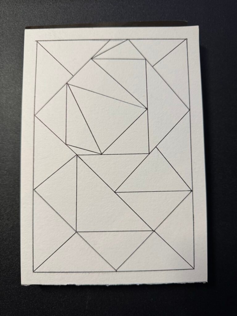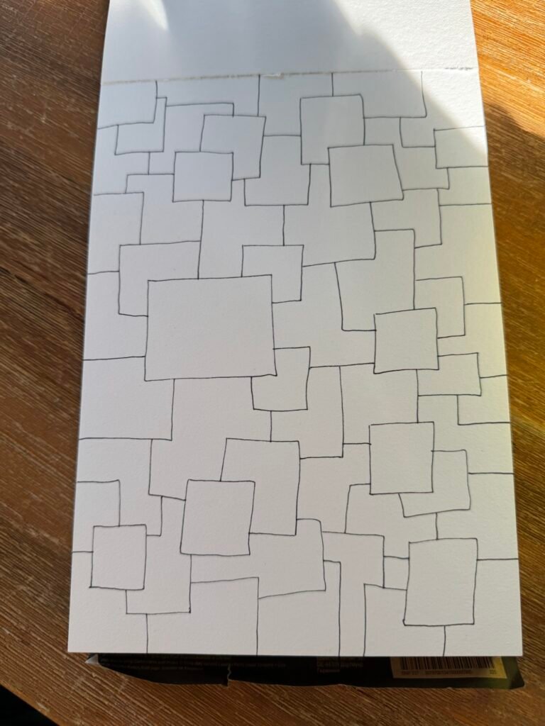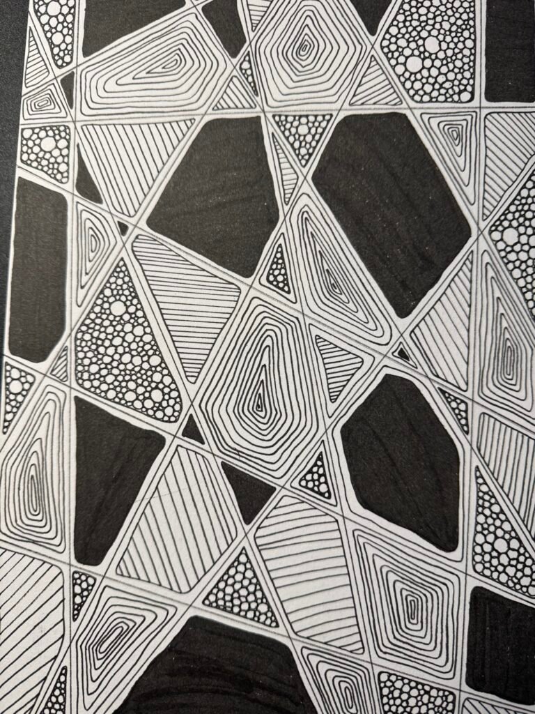 Ziehe lange Linien kreuz und quer über das Papier und fülle die entstehenden Flächen mit Mustern – Punkte, Wellen, Zickzacklinien.